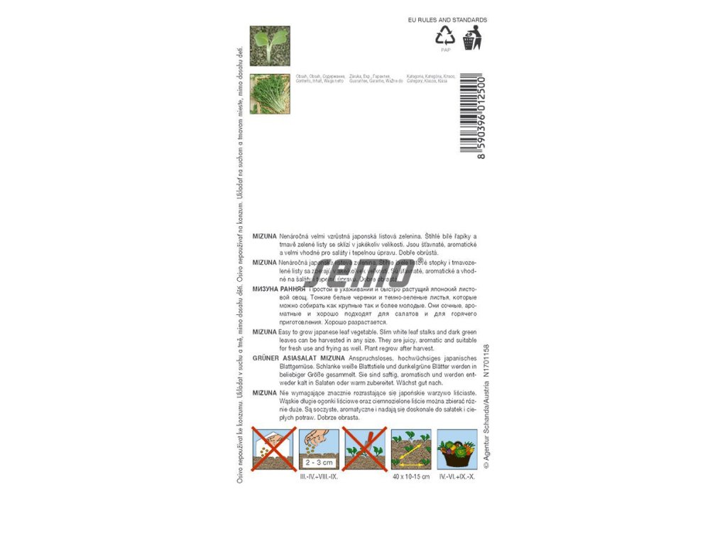 Mizuna je japonská lahůdková zelenina, od března do října je doba od výsevu do sklizně 30 až 40 dní, v zimním období se prodlužuje až na 60 dní.