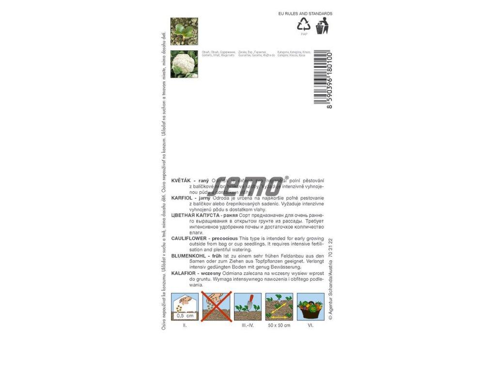 Velmi raná odrůda pro nejranější jarní polní pěstování ze sadby, růžice je střední, smetanově bílá, částečně zakrytá, o průměrné hmotnosti 370 g.