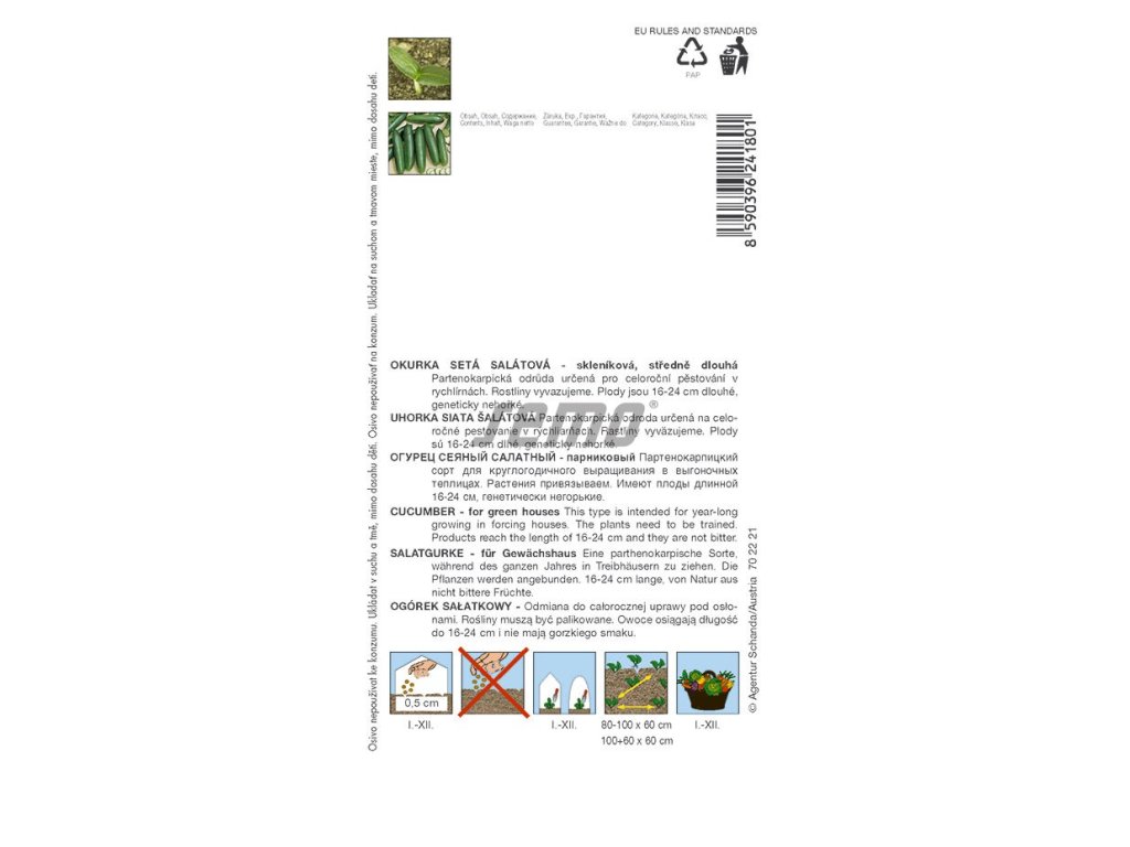 Salátovka typu Multifruit se středně dlouhými plody 16 – 24 cm, bez krčku, tmavozelená raná, určená pro celoroční pěstování ve sklenících a fóliovnících.