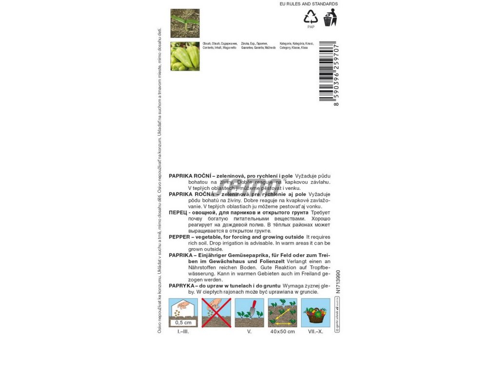 Paprika roční Slovanus F1 je velmi raný hybrid, mladé plody mají světle zelenou barvu, kterou v plné technické zralosti změní na smetanovou se zelenkavým nádechem.