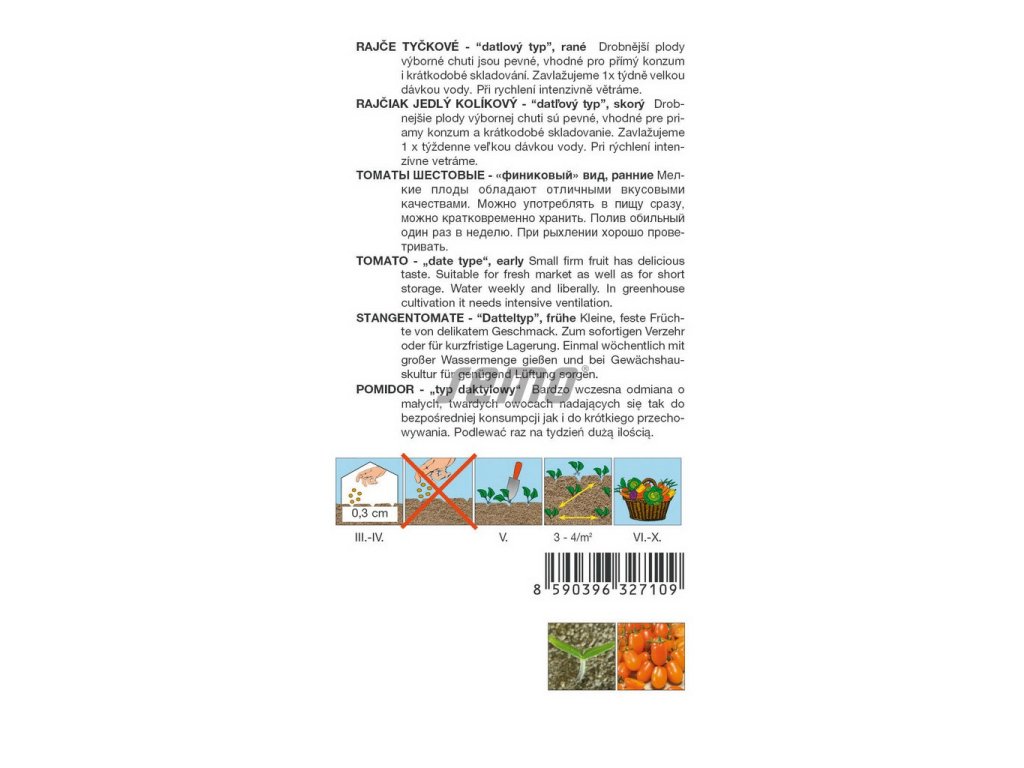 Tyčkové rajče s plody datlového tvaru, které zrají do žluto-oranžové barvy, mají hmotnost 16 – 20 g, jsou atraktivní nejen vzhledem, ale i ovocnou chutí.