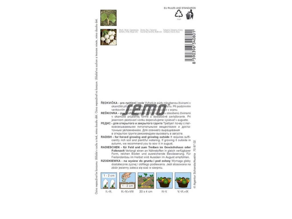 Raná odrůda ředkvičky se sněhově bílou barvou bulviček, je vhodná pro jarní i podzimní výsevy do fóliovníků, pařenišť i přímo na pole.