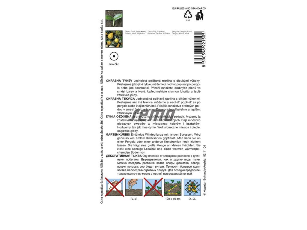 Jednoletá poléhavá rostlina s dlouhými výhony, kterou pěstujeme jako jiné tykve, směs rostlin s drobnými plody různých tvarů a barev, výhony až 4 m dlouhé.