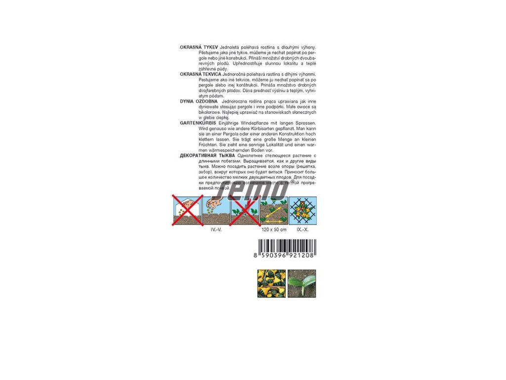 Jednoletá poléhavá rostlina s dlouhými výhony, kterou pěstujeme jako jiné tykve, má dvoubarevné žluto–zelené plody ve tvaru drobných hruštiček.